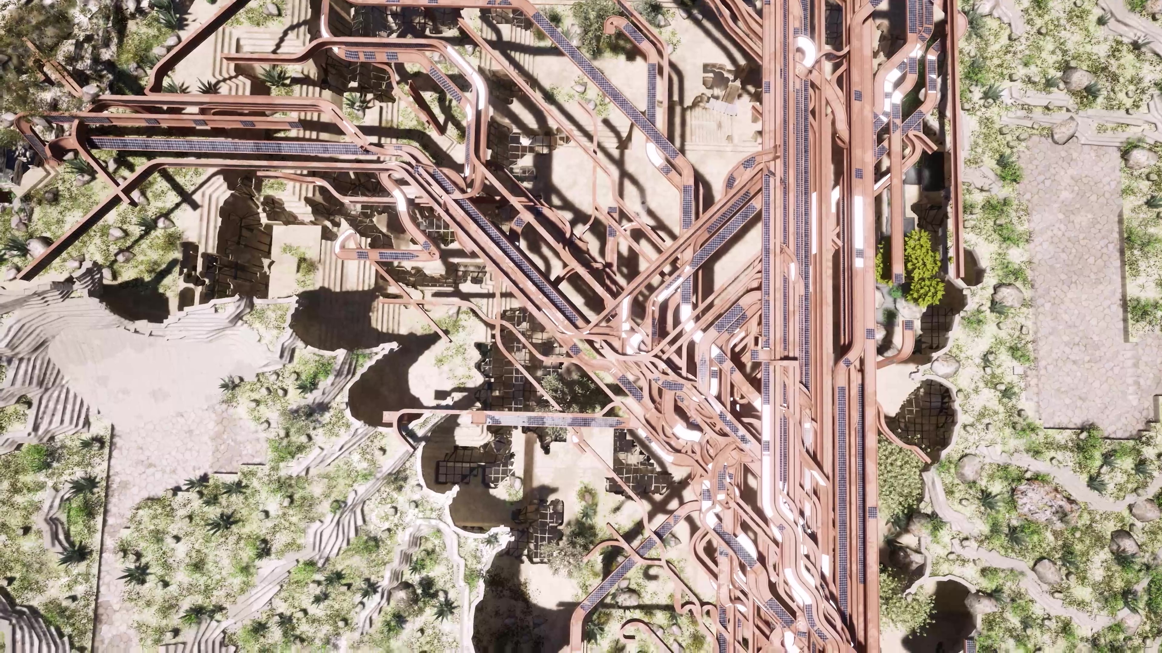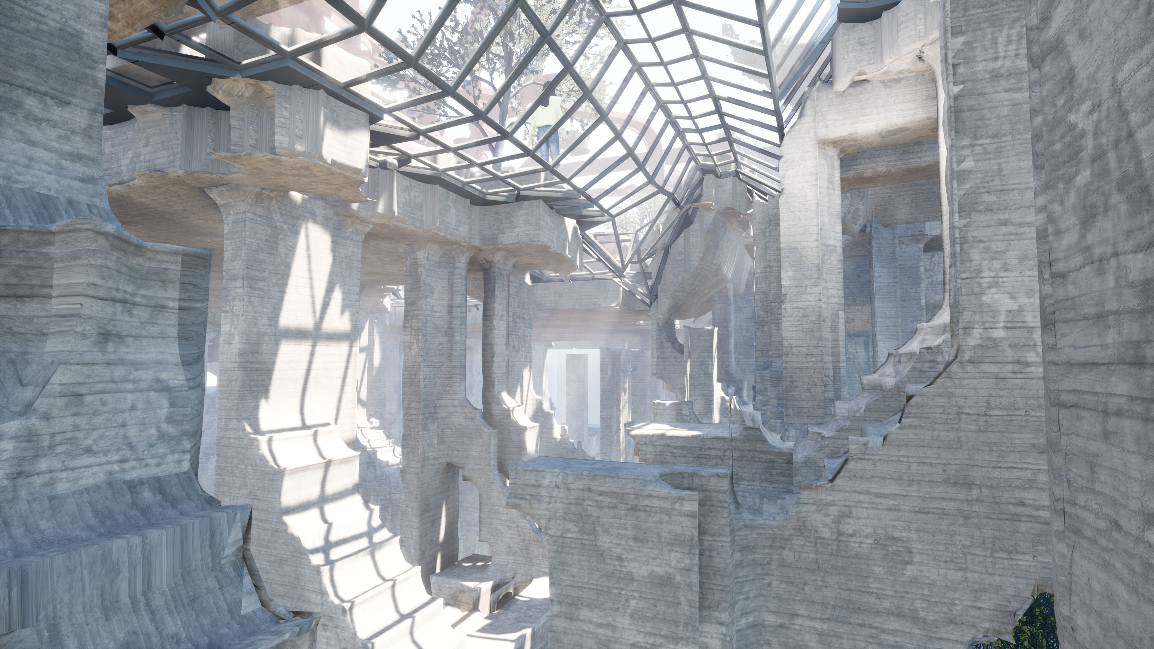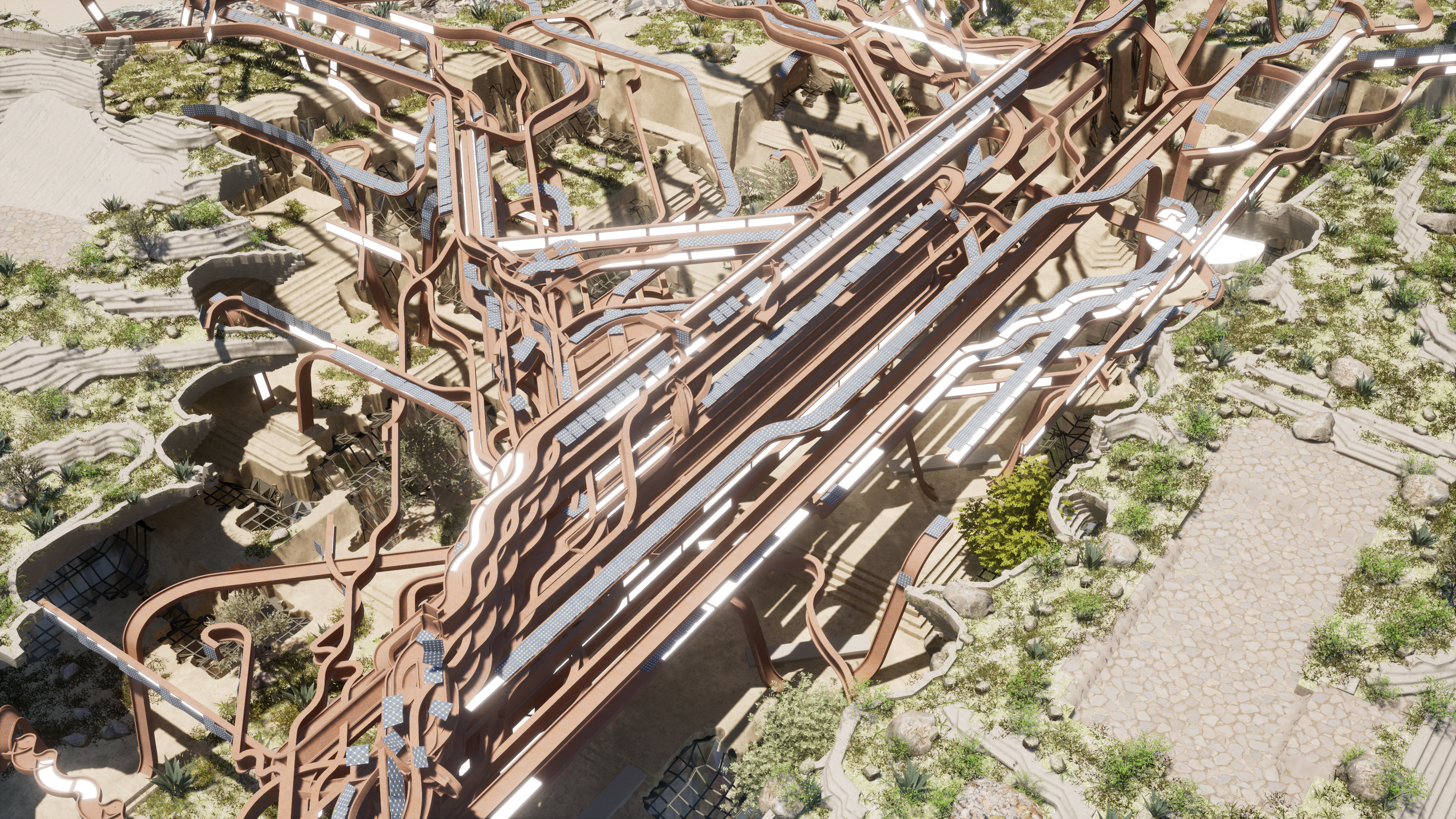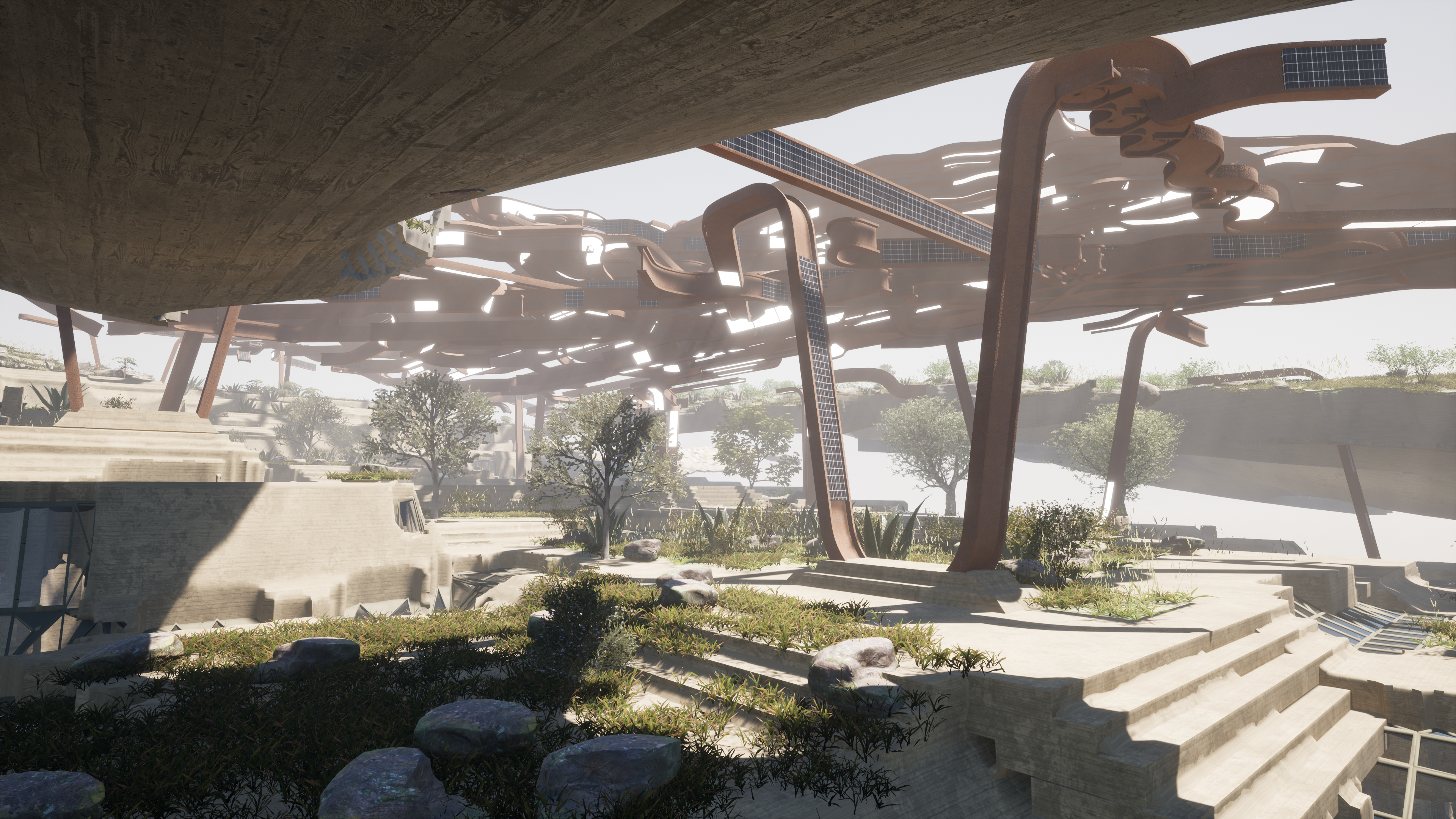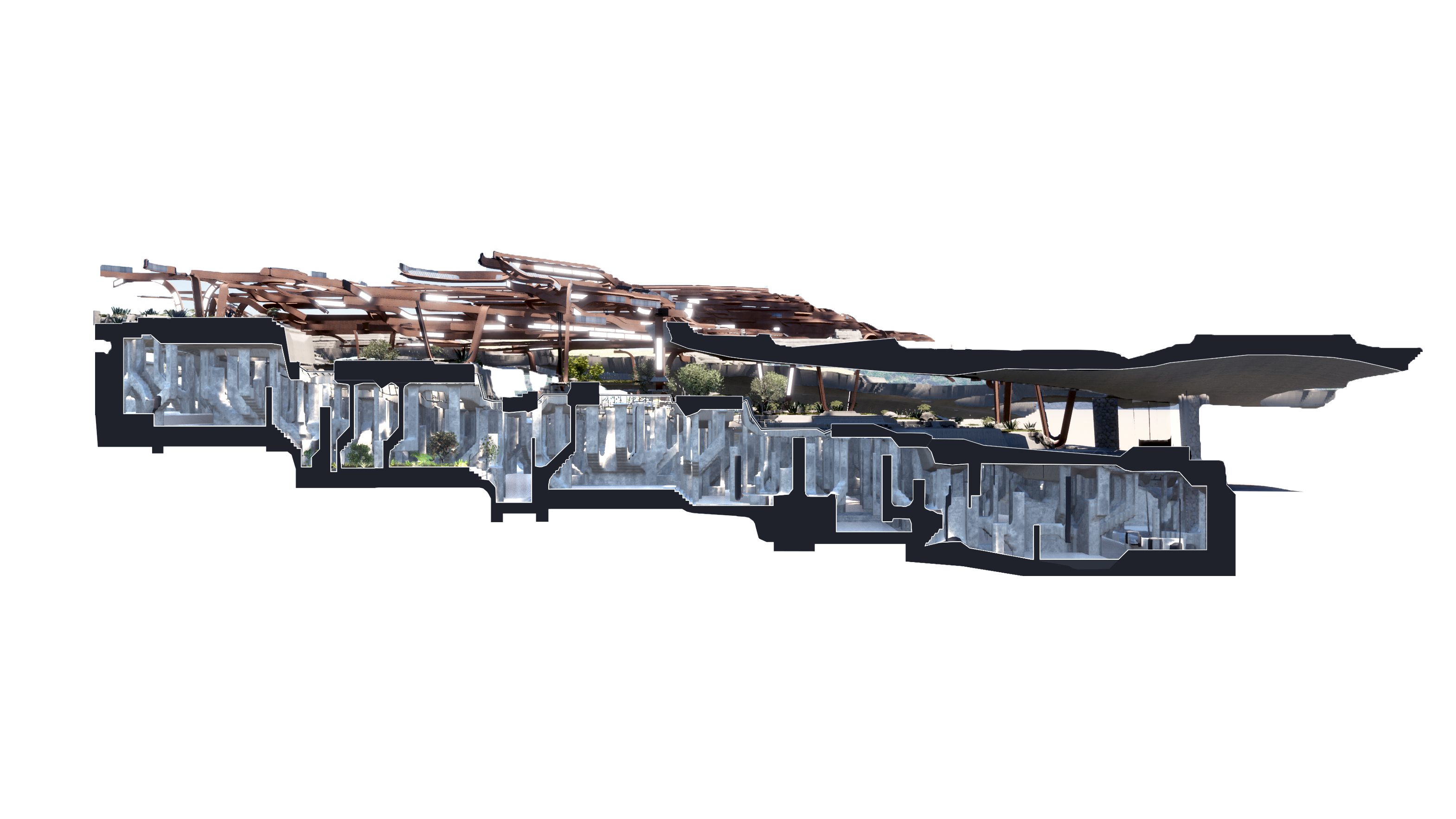 Additionally, the project utilizes layers of structures to provide a balance of solar shading and exposure to natural daylighting to underground spaces .